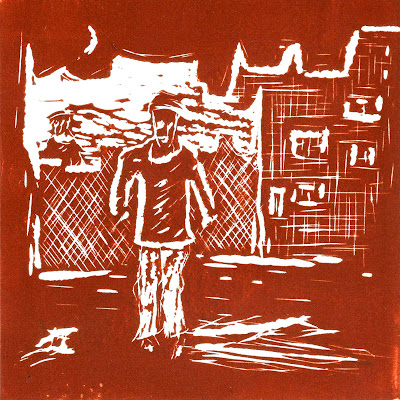 J'ai regravé mon lino synthétique pour en faire un personnage digne de l'Halloween et j'en ai tiré de multiples variantes.